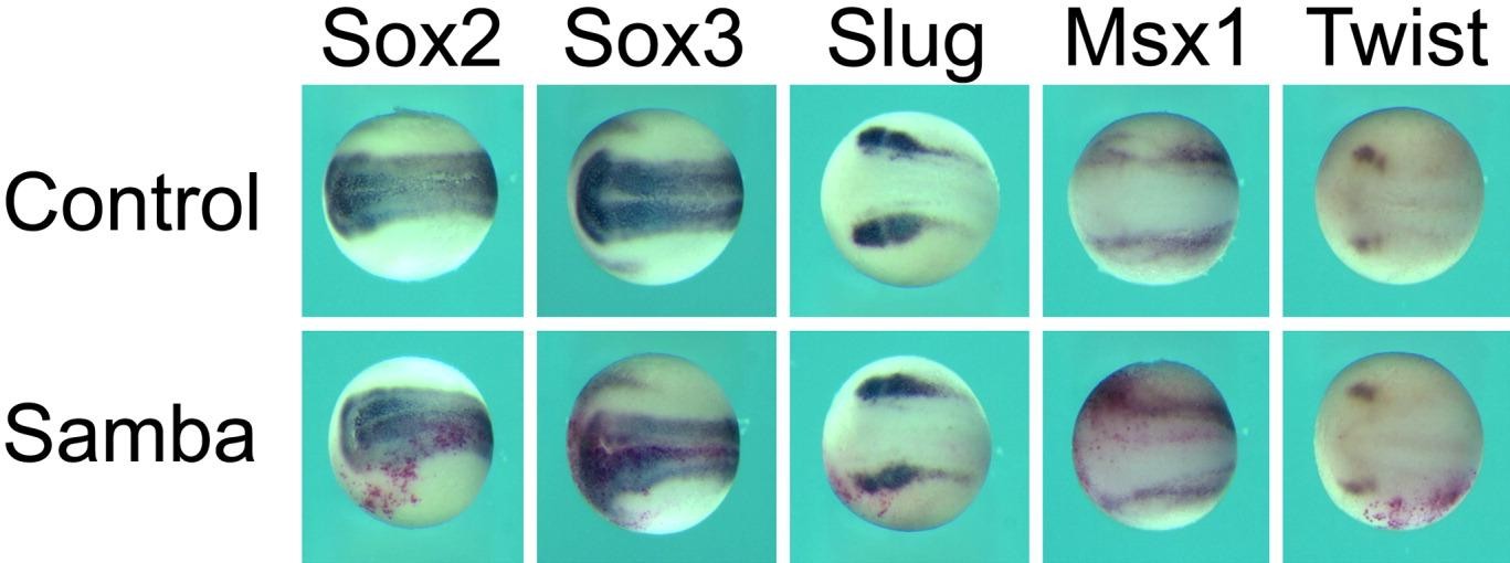 Figure 4. Overexpression of Samba does not affect neural and crest markers. Embryos co-injected with 200 pg of Samba and 100 pg of beta-galactosidase in one blastomere at two-cell stage were processed for in situ hybridization for the neural markers Sox2 and Sox3 and the crest markers Slug, Msx1, and Twist. None of the markers altered their expression pattern in the presence of excess Samba.