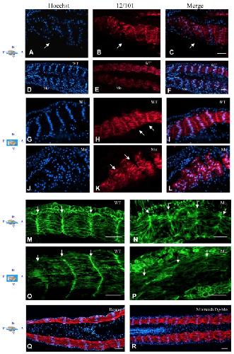 Fig. 5. Dystroglycan depletion disrupts myotome cells alignment and intersomitic cohesion. A,BâC: Stage 24. Control embryo sectioned and stained with Hoechst (blue, A), and immunostained with the 12/101 antibodies (red, B); merged image (C). Arrows show cells undergoing their rotation. DâL: Embryos were unilaterally injected at the two-cell stage with 28 ng of Dg morpholino (MO). At stage 24, embryos were fixed, sectioned and double stained with the 12/101 antibodies (red) and Hoechst (blue). DâF: Frontal section. The nuclei are randomly distributed on the injected side (lower part of the panel). GâI: Para-sagittal section, control side of the embryo. G: The nuclei exhibit a typical oval/elongated shape and are aligned in each somite. H: The somites are strongly cohesive the ones with the others. The 12/101 staining is concentrated at the intersomitic junctions (white arrows). I: Merge. JâL: Parasagittal section of the injected side. J: The nuclei are randomly distributed. K: The somites are less compact and less cohesive; the 12/101 staining is absent at the intersomitic junctions (white ar- rows); within somites, the cell alignment ap- pears affected. L: Merge. MâP: Embryos were unilaterally injected at the two-cell stage with Dg MO and mRNAs encoding a membrane-tagged green fluorescent protein (GFP). M: Stage 24, frontal section, control side. Cells are aligned parallel to the notochord and somite boundaries are well delimited (white arrows). N: Stage 24, frontal section, injected side. The somites are disorganized. Cells fail to extend and align within each somite. The intersomitic junctions fail to form correctly (white arrows). O: Stage 24, para-sagittal section, control side. Cells are aligned. Somite boundaries exhibit their characteristic chevron pattern (white arrows). P: Stage 24, para-sagittal section, injected side. Cells fail to align and boundaries are not well delimited (white arrows). Q: Frontal section of a rescued embryo stained with Hoechst (blue) and the 12/101 antibodies (red). R: Frontal section of an embryo injected with a five-nucleotide mismatch Dg-MO and stained with Hoechst (blue) and the 12/101 antibodies (red). The somite morphology and their number are not affected. Cells are aligned parallel to the notochord. WT, wild-type; Mo, injected side. Scale bar = 70 um.