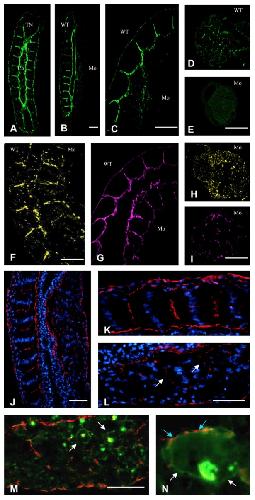 Fig. 7. Dg depletion and Dg without the cytoplasmic domain prevents laminin deposition at the somite boundaries. AâE: Immunodetection of the laminin. A: Frontal section of control embryo, stage 24. The laminin is present around the notochord, the neural tube, and at the intersomitic junctions. B: Frontal section of the ventral region of a unilaterally morpholino (MO) -injected embryo, stage 24. Laminin is detected at the intersomitic boundaries in the uninjected side (left) and absent in the injected side (right). C: Frontal section of the dorsal region of a unilaterally Mo-injected embryo, stage 28. The laminin is absent in the injected side (right) but present at the intersomitic junctions of the control side. D,E: Immunodetection of the laminin in explants. D: Laminin is deposited in control explant. E: MO-treated explant. Laminin was not detected. F: Frontal section, stage 28. Immunodetection of the integrins (injected side on the right). The integrins are localized at the intersomitic junctions in both the control and injected sides. G: Frontal section, stage 28. Immunodetection of the fibronectin (injected side on the right). The fibronectin is detected at the somite boundaries and around the notochord. H,I: MO-injected explants. H: Immunodetection of the integrins. I: Immunodetection of the fibronectin. JâN: Dg-deltaCyto mRNA was delivered unilater- ally and effects of the overexpression of the Dg-cytoplasmic mutant was analyzed at stage 24 on frontal section. JâL: Immunochemistry with Hoechst (blue) and the anti-laminin antibodies (red). J: Laminin is detected around the notochord and at the intersomitic boundaries in the control side (left). Laminin is absent at the intersomitic junctions in the injected side (right). K: Magnification of the control side. The nuclei exhibit a typical oval/elongated shape and are aligned in each somite. The laminin is present at both the somite/notochord and intersomitic boundaries. Somites are cohesives. L: Magnification of the Dg-deltaCyto mRNA-injected side. The nuclei are randomly distributed. The laminin is present at the somite/notochord boundaries, but its deposition at the inter- somitic junctions is severely disrupted. The fluorescence appears sparse within the putative somites (white arrows). M,N: Immunodetection of the green fluorescent protein (GFP) -tagged Dg-deltaCyto (green) and the laminin (red). M: The Dg-deltaCyto proteins are detected at the surface of somitic cells (white arrows). N: Magnification of one cell expressing the Dg-deltaCyto protein. Somitic cells expressing the Dg-deltaCyto proteins (white arrows) were also stained by the anti-laminin antibodies (blue arrows) and both proteins are co-localized at the level of the plasma membrane. Ch, notochord; TN, neural tube; WT, wild-type; Mo, injected side. Scale bar = 100 um.