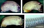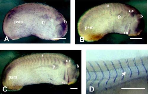 Figure 1. Dystroglycan transcript and protein expressions. A-C: Lateral view, whole-mount in situ hybridization at stage 21 (A), 23 (B), and 27 (C). Dg mRNAs are detected in the dorsal region, posteriorly in the presomitic mesoderm and in the mesoderm in a series of stripes. D: Stage 40, lateral view, in toto immunodetection. The staining of the Dg protein is associated with the intersomitic junctions and the notochord (white arrow). mu m; b, brain; ov, otic vesicle; psm, presomitic mesoderm; s, somites; va, visceral arches; p, pronephros and duct. Scale bar = 400 mu m.