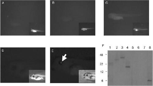 φC31 integrase-mediated transgenesis of insulated reporter plasmids generate Xenopus embryos with tissue-appropriate expression. In every case, the insert shows a brightfield image of the embryo. (A) Non-injected stage 42 embryo. (B) Stage 42 embryo injected with 5 pg of CMV-EGFP-DI-attB reporter plasmid. (C) Stage 42 embryo injected with 5 pg of CMV-EGFP-DI-attB reporter plasmid and 1 ng of integrase mRNA. (D) Stage 44 embryo injected with 5 pg of CL-EGFP-DI-attB plasmid alone. (E) Stage 44 embryo injected with 5 pg of CL-EGFP-DI-attB plasmid and 1 ng of integrase mRNA. GFP expression is indicated with the white arrow. (F) Southern blot demonstrating single integration events. Lanes 1 and 2 contains DNA harvested from single stage 46 CMV-EGFP-DI-attB transgenic embryos that expressed GFP uniformly. Lanes 3–4 contain DNA harvested from single stage 46 CL-EGFP-DI-attB transgenic embryos that expressed GFP in the lens of the eye. Lane 5 contains stage 46 non-injected DNA. Lane 6 contains DNA from a stage 46 embryo injected with CMV-EGFP-DI-attB plasmid alone. Lane 7 contains DNA from a stage 46 embryo injected with CL-EGFP-DI-attB plasmid alone. Lane 8 contains 10 pg of CMV-DI-EGFP-attB plasmid linearized with BamHI. Markers in kilobase pairs are indicated to the left of the membrane.