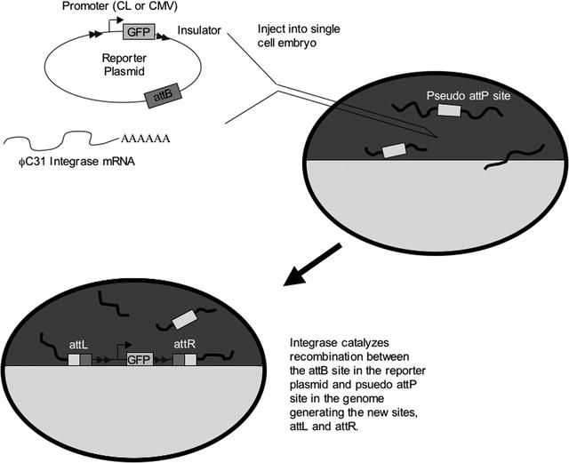 Representation of φC31 integrase-mediated transgenesis in Xenopus laevis. The reporter plasmid containing an attB site and an insulated reporter gene is injected along with integrase mRNA into single-cell embryos. The chromosomes (thick black lines) contain numerous pseudo-attP sites. Inside the single-cell embryo, the integrase protein catalyzes recombination between the attB site in the reporter plasmid (thin black line) and a pseudo-attP site in the embryo’s genome (thick black line). Recombination results in the formation of two new attachment sites, attR and attL flanking the integrated reporter plasmid.