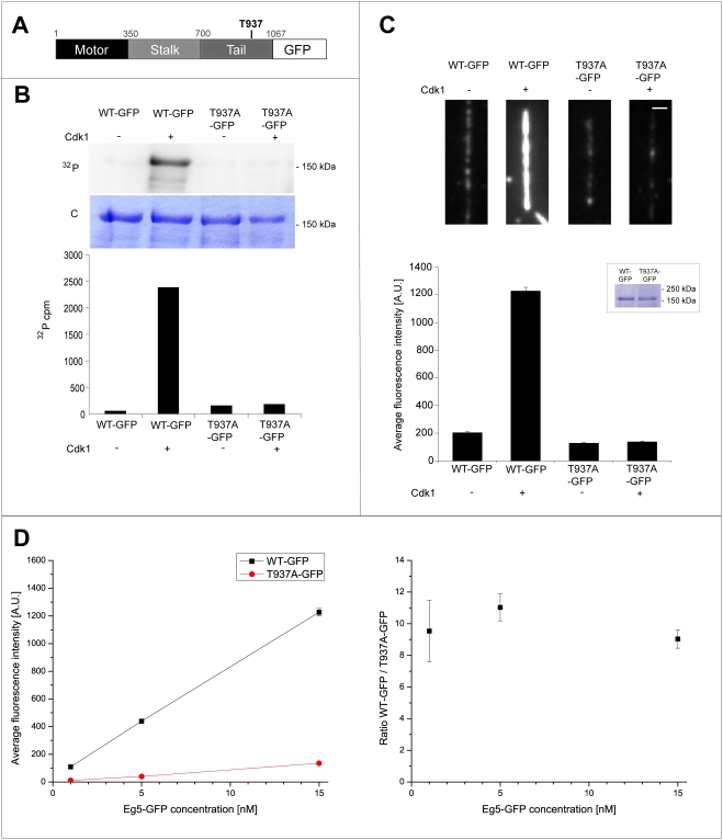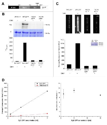 Figure 2. Phosphorylation of Eg5 by Cdk1 increases Eg5 binding to microtubules in buffer.(A) Schematic representation of the Eg5-GFP sequence. (B) In vitro phosphorylation of wild-type Eg5-GFP and Eg5T937A-GFP with [γ32P]ATP in buffer in the presence (+) or absence (−) of Cdk1/cyclin B. Autoradiography (32P) and coomassie-stained polyacrylamide gel (C) are shown. Quantitative measurement of radioactivity of the corresponding bands from the SDS-gel. The degree of phosphorylation of Eg5 wild-type is 75.6% and is strongly reduced to 5.9% for Eg5T937A-GFP. (C) Phosphorylation by Cdk1 increases the binding of Eg5 to microtubules in vitro: Representative examples for time-averaged images of the Eg5-GFP intensity on single immobilized microtubules as measured by TIRF microscopy (top). Wild-type Eg5-GFP (WT-GFP) and the non-phosphorylatable mutant (T937A-GFP) treated with ATP in the presence or absence of Cdk1/cyclin B were added to immobilized microtubules at a concentration of 15 nM. Scale bar is 1 µm. Bar plot of average Eg5-GFP signals (bottom) as obtained from 45–90 microtubules per condition as described above. Error bars are standard errors. Insert: Loading control showing the amount of Eg5-GFP in the phosphorylation reactions used in the experiment. (D) Average intensity signals (left) and intensity ratios (right) of Eg5-GFP and Eg5T937A-GFP on microtubules after Cdk1/cyclin B treatment plotted as a function of different Eg5 construct concentrations. For the average intensity signals (left), the values (in A.U.) are for WT and T937A at the concentration of 1 nM: 109±7 and 11±2, at the concentration of 5 nM: 439±17 and 40±3, at the concentration of 15 nM: 1226±39 and 136±8, respectively. Error bars are standard errors (in most cases obscured by the data symbol).
