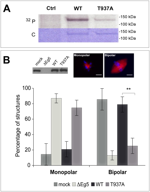 Figure 3. Spindles do not assemble in Eg5 depleted Xenopus egg extract in the presence of Eg5T937A.(A) Phosphorylation of wild-type Eg5 and of Eg5T937A in mitotic Xenopus egg extract, showing a strong reduction of the degree of phosphorylation of Eg5T937A. As a control, an extract without recombinant Eg5 is shown (Ctrl). Autoradiography (32P) and Coomassie-stained polyacrylamide gel (C) are shown. (B) Western blot (top left) showing the amount of Eg5 in mock depleted extract (mock), in Eg5 depleted extract (ΔEg5) and in Eg5 depleted extract after addition of Eg5 wild-type (WT) or of Eg5T937A (T937A). Fluorescence images of a monopolar spindle after Eg5 depletion (top middle) and of a bipolar spindle after ‘mock’ depletion (top right). Graphs (bottom) representing the percentages of monopolar and bipolar spindles under the conditions as indicated. More than 120 structures per condition were included in the analysis. ** indicates statistical difference (p = 0.0031, significance level 0.05). Spindle assembly cannot be rescued by Eg5T937A at the concentration used. Microtubules are TAMRA-labeled (red) and DNA is stained with Hoechst (blue). Scale bar is 10 µm.