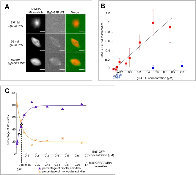 Figure 4. Cdk1 maintains the amount of Eg5 on spindle microtubules above a critical concentration required for spindle bipolarity.(A) Fluorescence images of different representative structures at varying Eg5-GFP concentrations added to Eg5 depleted extract. Fluorescence of TAMRA-labeled microtubules (left) and Eg5-GFP (middle) is shown together with merged images (right). Scale bar is 10 µm. (B) Graph representing the ratios of averaged GFP intensities per TAMRA intensities as a function of varying wild-type Eg5-GFP concentrations (red squares) and mutated Eg5T937A-GFP (blue circle). The ratios were normalized setting the ratio at 0.46 µM Eg5-GFP to 1. The line is a linear fit to the wild-type data (f(x) = 1.62 µM−1*x). Error bars indicate the standard error. (C) Graph illustrating the percentages of bipolar spindles (purple triangles) and of monopolar spindles (orange stars) as a function of the Eg5-GFP concentration. Depending on the condition, between 9 and 76 (on average 28) structures were counted per data point. The lines are fits to the data with using f(x) = 80%−69%*exp(−c/0.054 µM) for percentages of bipolar spindles and f(x) = 20%+69%*exp(−c/0.054 µM) for percentages of monopolar spindles. Concentrations on the x-axis were transformed into fluorescence ratios using the regression from B. The dashed lines indicate the fluorescence ratios for mutated Eg5T937A-GFP at the concentrations used in B.