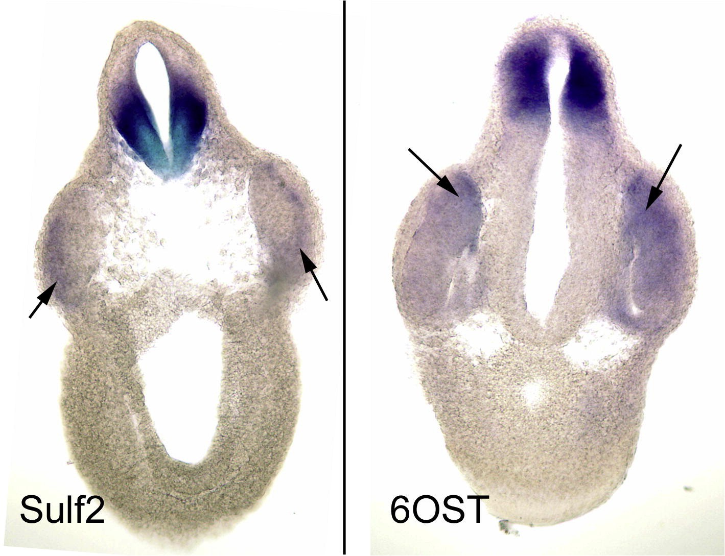 Heparan sulfate proteoglycans (HSPGs) are abundant cell surface molecules, consisting of glycosaminoglycan (GAG) chains bound to a protein core. There is high diversity in the sulfation pattern within each GAG chain, creating specific binding sites for many proteins including cell signalling factors, whose activities and distribution are modified by their association with HSPGs (Danesin et al., 2006; Freeman et al., 2008). Here, we describe the distinct expression of three enzymes which modify the 6-O-sulfation state of HSPGs: two 6-O-endosulfatases (Sulf1 and Sulf2), and a 6-O-sulfotransferase (6OST-1). We use in situ hybridisation to determine the spatial distribution of transcripts during tailbud stages of Xenopus laevis development, with a particular focus on neural regions where the 6-O-sulfatases are expressed ventrally and the 6-O-sulfotransferase is restricted dorsally. The complementary expression of these enzymes in the hindbrain and neural tube suggest a role for specific HSPG structure in dorsoventral patterning, possibly through modifying the activity or distribution of signalling molecules such as BMP, Sonic hedgehog, Wnt and/or FGF.