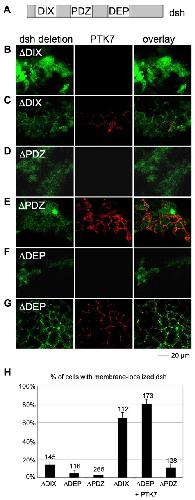 Fig. 2. The PDZ domain is necessary for PTK7-dependent membrane translocation of dsh. (A) Dsh protein structure indicating the DIX, PDZ and DEP domain. RNA of GFP-tagged deletion mutants of these domains were expressed alone or in combination with wild-type PTK7 RNA in animal caps. Protein localization was determined by confocal microscopy. (B) Animal cap injected with 100 pg δDIX-GFP RNA showing cytoplasmic protein localization. (C) Co-injection of 500 pg PTK7-myc RNA partially translocates the cytoplasmic δDIX-GFP protein to the membrane. (D) Animal caps injected with 100 pg δPDZ-GFP RNA show only cytoplasmic localization of the protein. (E) The same is seen after co-expression with PTK7-myc RNA. (F) Animal caps injected with 100 pg δDEP-GFP RNA express the protein in the cytoplasm, whereas (G) co-injection of 100 pg PTK7-myc RNA leads to membrane recruitment. (H) Graph summarizing the percentage of cells with membrane-localized dsh. Only cells with membrane expression of PTK7 were analyzed for dsh localization. The total number of cells is indicated on each column.