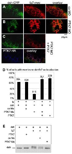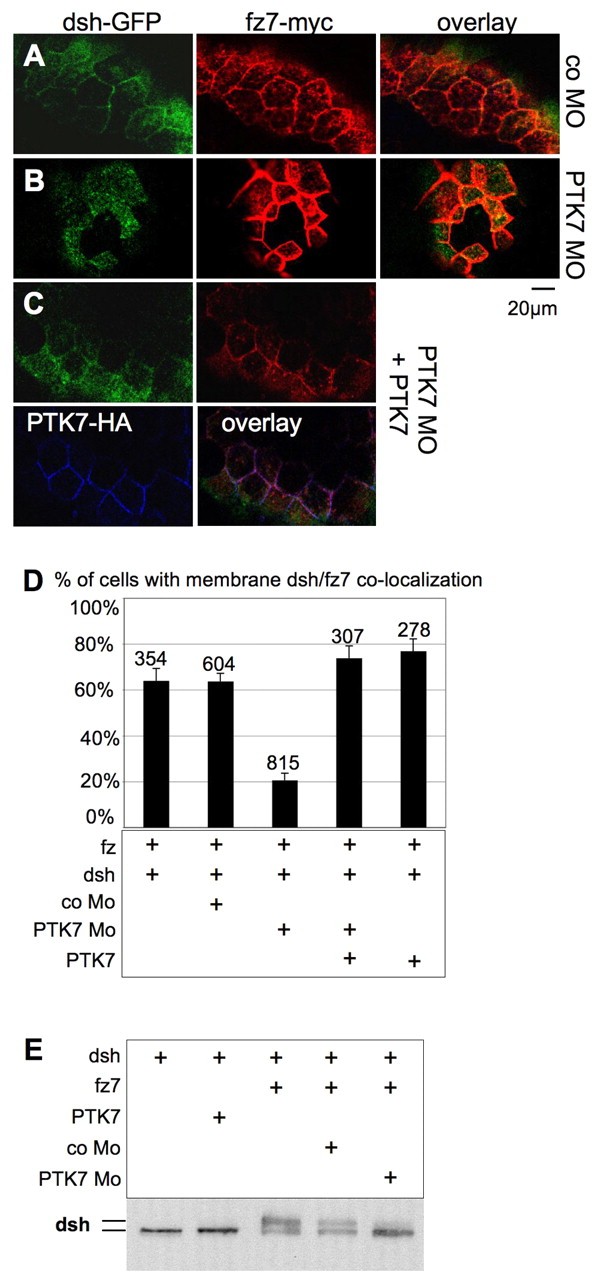 Fig. 3. PTK7 is required for fz7-mediated dsh recruitment and phosphorylation. (A-D) PTK7 is required for fz7-mediated dsh recruitment to the plasma membrane. GFP-tagged dsh is shown in green, myc-tagged fz7 in red, HA-tagged PTK7 in blue. (A) GFP-tagged dsh is localized to the plasma membrane in animal caps injected with 100 pg dsh-GFP RNA, 100 pg fz7-myc RNA and 20 ng control MO. (B) GFP-tagged dsh is not recruited to the plasma membrane in animal caps injected with 100 pg dsh-GFP and 100 pg fz7-myc RNA and 20 ng PTK7 MO. (C) Co-injection of 100 pg wild-type PTK7 RNA lacking the MO binding site rescues dsh-localization of animal caps injected with 100 pg dsh-GFP RNA, 100 pg fz7-myc RNA and 20 ng PTK7 MO. (D) Graph summarizing the percentage of cells with simultaneously membrane-localized dsh and fz7. The total number of cells is indicated on each column. (E) PTK7 is required for fz7-dependent hyperphosphorylation of dsh. Embryos were injected with 100 pg dsh-myc RNA, 100 pg fz7 RNA, 500 pg PTK7-myc RNA, 20 ng control MO or 20 ng PTK7 MO in the combinations indicated. Animal caps were cut at stage 9 and their lysates were analyzed by western blotting using anti-myc antibodies. Hyperphosphorylated dsh is detected as a second high molecular weight band. One representative experiment of three independent experiments is shown.