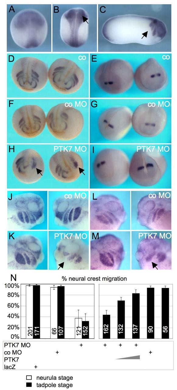 Fig. 4. PTK7 is expressed in cranial neural crest cells and required for their migration. (A-C) PTK7 expression pattern in Xenopus laevis detected by whole-mount in situ hybridization. (A,B) PTK7 is broadly expressed in premigratory neural crest cells at early neurula stages (black arrow). (C) At stage 26, PTK7 expression is detected in migrating cranial neural crest cells (black arrow). (D-M) Embryos injected in one blastomere at the two-cell stage with different constructs in combination with 100 pg GFP RNA as a lineage tracer. Neural crest migration was analyzed at neurula stages using the neural crest marker twist (D,F,H) or the midbrain-hindbrain marker engrailed (E,G,I). The injected side is shown on the right. (D,E) GFP-injected embryos. (F,G) Embryos co-injected with 10 ng control MO and GFP RNA. (H,I) Embryos co-injected with 10 ng PTK7 MO and GFP RNA. (J-M) Tadpole embryos analyzed by in situ hybridization with the neural crest markers twist (J,K) or AP-2 (L,M). The injected side is shown on the right. (J,L) Tadpoles injected with 10 ng control MO und 100 pg GFP RNA. (K,M) Tadpoles injected with 10 ng PTK7 MO and 100 pg GFP RNA. Inhibition of cranial neural crest migration is marked by arrows in H,K,M. (N) Graph summarizing the MO injection experiments. Left graph summarizes five independent experiments (analyzing neurula stages) and six independent experiments (analyzing tadpole stages), respectively. The right graph summarizes three independent rescue experiment. The percentage of migrating neural crest cells was determined by twist in situ hybridization. Columns are labeled with the number of injected embryos.