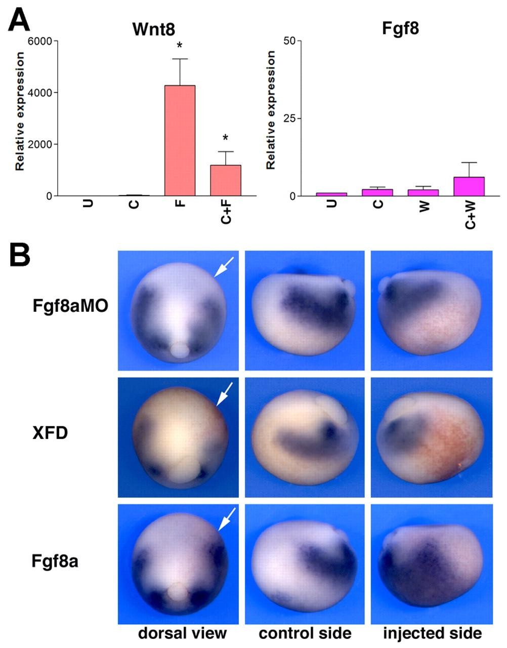 Fig. 5. Fgf8a is a strong inducer of Wnt8 in animal explants and in whole embryos. (A) Animal explants derived from embryos injected with Fgf8a (F) or with a combination of Fgf8a and Chordin (C+F) show a strong upregulation of Wnt8 after 4 hours in culture. For comparison, Wnt8 (W) or Wnt8 and Chordin (C+W) co-injection had little effect on the expression levels of Fgf8. U, uninjected animal explant. Values (n=3) are presented as mean±s.e.m.; *P<0.05, versus uninjected animal explant (U). (B) In whole embryos, loss of Fgf function by injection (arrow) of Fgf8aMO (50 ng) or a dominant-negative Fgf receptor (XFD; 2 ng) results in a reduction of Wnt8 expression in the involuting mesoderm at stage 12. Conversely, Fgf8a (5 pg) mis-expression strongly upregulates Wnt8. For all injections, dorsal and lateral views (control and injected sides) of the same embryo are shown. Dorsal views, anterior to the top, injected side to the right (arrows). Lateral views, dorsal to the top; for the control side anterior is to the left, for the injected side anterior is to the right.