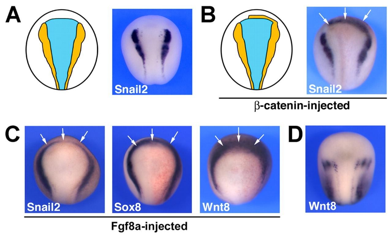 Fig. 6. Fgf8a induces NC at the anterior neural fold indirectly. (A) The anterior neural plate (blue) is devoid of NC tissue (orange) as a result of the activity of a Wnt inhibitor, Dkk1 (Carmona-Fontaine et al., 2007). Snail2 expression is shown in a control embryo at stage 15. (B) β-catenin misexpression (200 pg) can overcome this inhibition to induce NC markers (Snail2) at the anterior neural fold (arrows). (C) Fgf8a (5 pg) misexpression can also induce NC markers (Snail2 and Sox8) at the anterior neural fold (arrows), an activity that is mediated by upregulation of Wnt8 in this region of the embryo (arrows). (D) Normal pattern of expression of Wnt8 in a control embryo at the same stage. In all panels the embryos are viewed from the dorsal side, anterior to the top.