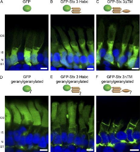 Figure 5. Localization of soluble and geranylgeranylated GFP-tagged syntaxin 3 mutants in transgenic Xenopus rods. (A) Soluble GFP. (B) GFP-tagged syntaxin 3 lacking both the SNARE and transmembrane domains. (C) GFP-tagged syntaxin 3 lacking the transmembrane domain. (D) Geranylgeranylated GFP. (E) Geranylgeranylated GFP-tagged syntaxin 3 lacking the SNARE homology domain and transmembrane domain. (F) Geranylgeranylated GFP-tagged syntaxin 3 lacking the transmembrane domain. OS, outer segment; IS, inner segment; N, outer nuclear layer; ST, synaptic terminal. Bars, 5 μm. |