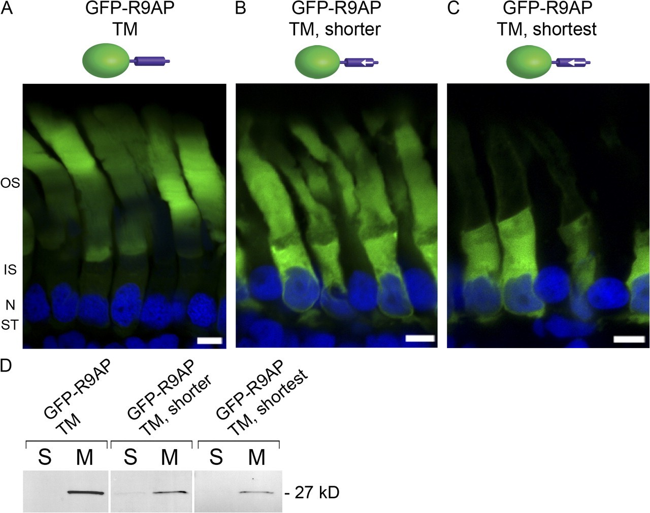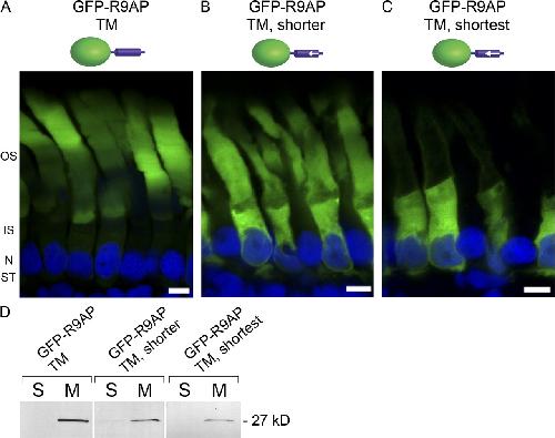 Figure 9. Localization of GFP-tagged R9AP transmembrane domain length mutants in transgenic Xenopus rods. (A) GFP-tagged transmembrane domain from R9AP. (B) GFP-tagged transmembrane domain from R9AP shortened by two amino acid residues. (C) GFP-tagged transmembrane domain from R9AP shortened by four amino acid residues. (D) Xenopus tadpole retinas expressing GFP-tagged R9AP transmembrane domains of various lengths as indicated were fractionated into soluble and membrane pools by sonication and sedimentation at 120,000 g. Proteins in each fraction were Western blotted using an antibody against GFP. Lane S, soluble protein fraction; lane M, membrane fraction. OS, outer segment; IS, inner segment; N, outer nuclear layer; ST, synaptic terminal. Bars, 5 μm. |