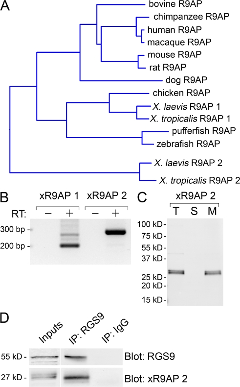 Figure 2. Identification of the photoreceptor-specific R9AP isoform in Xenopus. (A) Phylogeny tree of R9AP protein sequences built using the Neighbor-Joining method. Accession nos. are as follows: bovine, AAM67417; chicken, NP_989836; chimpanzee, XP_512566; dog, XP_855518; human, NP_997274; macaque, XP_001087093; mouse, NP_665839; pufferfish, CAF92756; rat, XP_001079782; zebrafish, XP_687644. Xenopus tropicalis R9AP1 is deduced from genome v4.1, scaffold 94 (920566:921276), and X. tropicalis R9AP2 is deduced from genome v4.1, scaffold 761 (402303:408685). (B) RT-PCR amplification of xR9AP1 and xR9AP2 transcripts from Xenopus retina; omission of reverse transcription (RT) in parallel samples served as a negative control for DNA contamination. (C) Western blot of Xenopus retina extract probed with the antibody specific to xR9AP2. Lane T, total extract; lane S; soluble protein fraction; lane M, membrane fraction. Note that the xR9AP2 band is a doublet, which reflects the previously documented phosphorylation of R9AP in photoreceptors (Martemyanov et al., 2003). (D) xR9AP2 coimmunoprecipitates with RGS9-1 from Xenopus retina. Beads coated with sheep IgG were used for the negative control. |