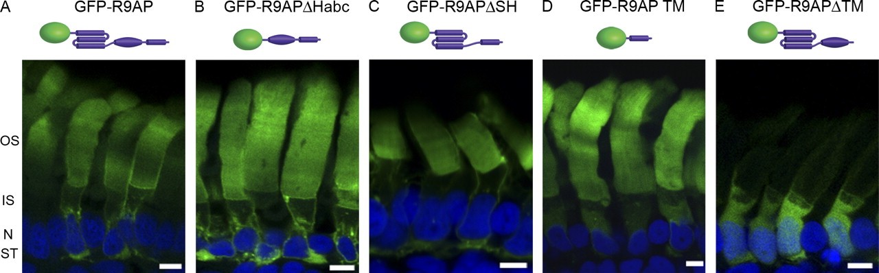 Figure 3. Localization of GFP-tagged R9AP and R9AP mutants in transgenic Xenopus rods. The following constructs were expressed in transgenic Xenopus rods: full-length GFP-tagged R9AP (A), GFP-tagged R9AP lacking the Habc domain (B), and GFP-tagged R9AP lacking the SNARE homology (SH) domain (C). (D) GFP-tagged transmembrane domain from R9AP. (E) GFP-tagged R9AP lacking the transmembrane domain. In all panels nuclei are counterstained with Hoechsts (blue). OS, outer segment; IS, inner segment; N, outer nuclear layer; ST, synaptic terminal. Bars, 5 μm. |