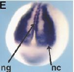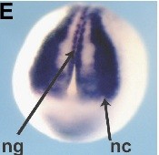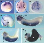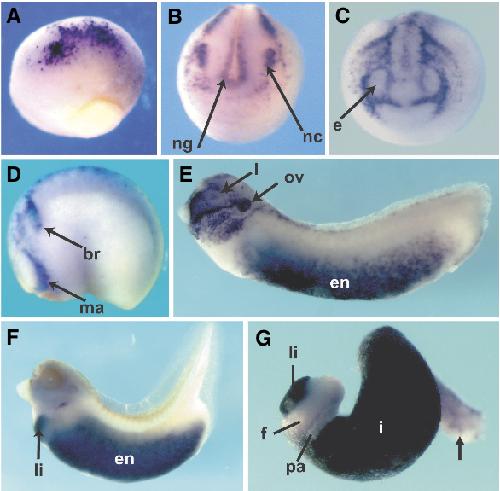 Fig. 7. Developmental expression of C9 from gastrula to organ bud stage. Anterior is to the left and dorsal to the top unless otherwise indicated. (A) Dorsal view of stage 10 embryo showing early spotted expression dorsal ectoderm. Anterior is to the top. (B) Anterior view of stage 17 embryo showing discrete neural crest (nc) and neural groove expression (ng). (C) Anterior view of stage 19-20 embryo. The three segments of the anterior neural crest show discrete expression at this stage. Mandibular segment ex- pression surrounds the presumptive eye field (e). (D) Lateral view of stage 22 embryo shows expression in mandibular (ma) and branchial segments (br) of anterior migrating neural crest. There is discrete hyoid expression noticeable between those two seg- ments. (E) Stage 27 embryo. Neural crest expression is seen in all three segments, as well as in the otic vesicle (ov), the lens (l), and the endoderm (en). (F) Stage 35 embryo shows strong liver and endodermal expression. (G) Isolated gut tube shows liver (li) and intestinal expression sparing the foregut (f), but no distal intestinal (proctodeum) expression (arrow); (lu) lung, (pa) pancreatic bud. |