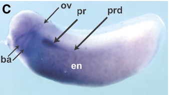 Fig. 5 (Left). Developmental expression of C3bC4bi. (A) Anterior view of a neurula stage embryo shows strong expression in the endoderm (en) lateral and ventral to the neural plate (np). (B) Transverse section of an early tailbud embryo in the presumptive trunk area. Dorsal is to the top. Expression is in the peripheral endoderm (large arrow) and in the archenteron roof (small arrow). Double arrows indicate early expression in presumptive kidney domains. (C) Tailbud embryo. Anterior is to the left. Endodermal expression is more extensive although not yet uniform. Expression in branchial arches (ba), the otic vesicle (ov), the pronephros (pr), and the pronephric duct (prd) are indicated. (D) Section through the proximal trunk of a tailbud embryo highlighting