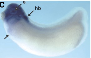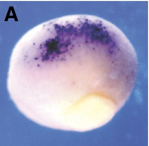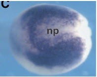 c3 (complement component 3) gene expression in Xenopus laevis embryo via in situ hybridization, NF stage 13, dorsal view, anterior left. |