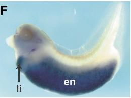 strong expression in the developing kidney. Dorsal is to the top; (n) notochord, (s) somite. (E) Isolated larval gut reveals strong expression in presumptive intestine (i) and liver (li), but no expression in foregut (f) and distal most segment of the developing intestine. |
