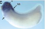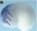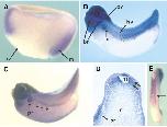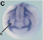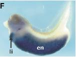Fig. 6 (Right). Developmental expression of Properdin. Anterior is to the left and dorsal to the top unless otherwise specified. (A) Anterior view of a neurula stage embryo. Arrow indicates neural crest expression. (B) Late neurula/early tadpole stage embryo. Arrows indicate expression in mandibular, hyoid and mandibular segments of anterior neural crest (from anterior to posterior). (C) Tailbud embryo shows strong cephalic expression. Intense expression in developing eye (e) and hindbrain (hb) are indicated. The ventral arrow highlights beginning expression in the anterior endoderm. (D) Cross section through the hindbrain of the embryo in (C). Dorsal is to the top. Expression is limited to the dorsal most part of the neural tube, in the periventricular cells of the hindbrain; (v) ventricle. (E) Section through the developing eye of a tailbud embryo shows strong expression in the lens. Anterior is to the right. (F) In the isolated larval gut expression is confined to the liver bud only (li); (f) foregut, (i) presumptive intestine, (pa) pancreas. |