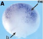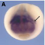 cfi (complement factor I) gene expression in Xenopus laevis embryo via in situ hybridization, NF stage 14, anterior view, dorsal up. |