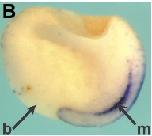 Fig. 1. Developmental expression of C1qA. (A) Bissected gastrula. Dorsal is to the right. Expression is restricted to the marginal zone mesoderm indicated by the arrow;(b) blastpore, (m) mesoderm. (B) Stage 28 embryo. Anterior is to the left and dorsalto the top. There is strong expression in the cephalic structures, especially in the branchial arches (ba) and in the otic vesicle (ov). Expression in the intersomitic veins is visible (isv). Pronephric expression has begun (pr). The small arrows indicate expression in the pronephric duct. (C) Stage 35 embryo shows detailed expression in pronephros (pr) and duct. At this stage, expression in the lateral muscle presursors (small arrows) is visible ventral to the duct. (D) Transverse section through an age- matched embryo to (C). The section is at the level of the pronephros. Dorsal is to the top. Somitic expression is most pronounced in the cells adjacent to the neural tube (nt) as indicated by the small arrows, and in the pronephros (pr). There is no staining in the notochord (n). (E) Ventral view of a stage 35 embryo reveals staining consistent with ventral blood island expression (arrow). |