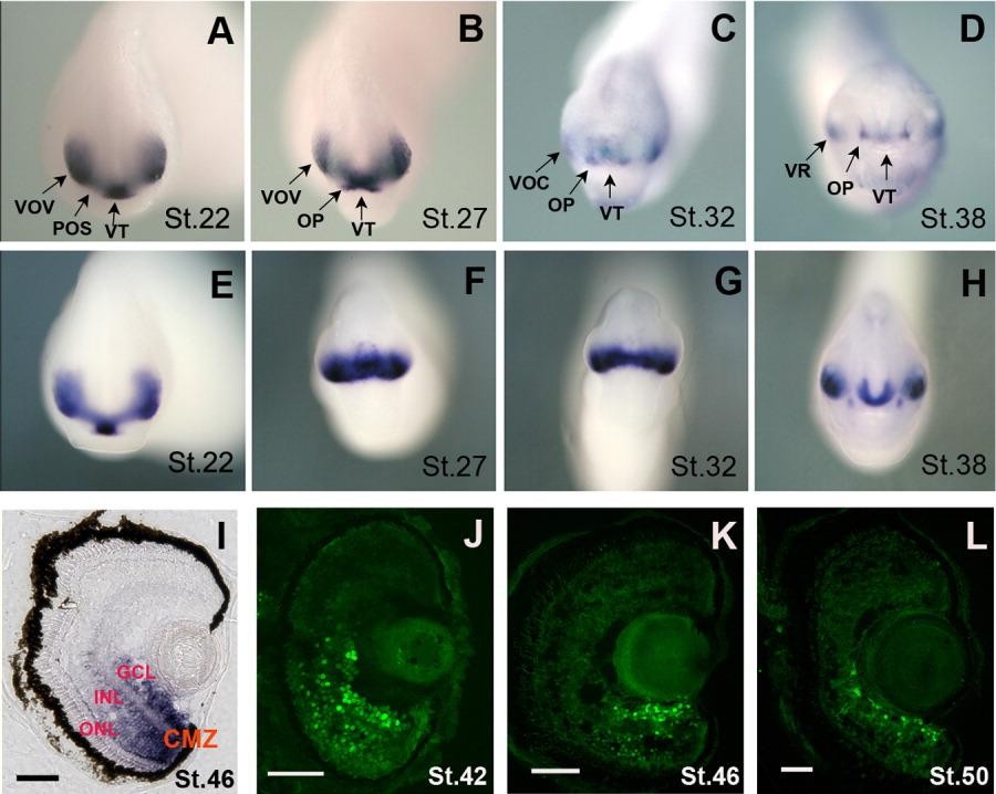 Figure 1. A-L: Expression of Xvax2 as detected by immunohistochemistry (A-D,J-L) and in situ hybridization (E-I) on whole embryos (A-H) and coronal sections of eye (I-L) of Xenopus laevis. The developmental stages (St.) are indicated in each panel. Whole embryos are shown as anterior views, and the sections with dorsal side up. op, olfactory placode; pos, presumptive optic stalk; vov, ventral optic vesicle; voc, ventral optic cup; vt, ventraltelencephalon; CMZ, ciliary marginal zone; GCL, ganglion cell layer; INL, inner nuclear layer; ONL, outer nuclear layer. Scale bars = 100 mu m.