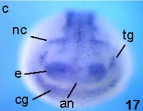 btbd6 (BTB (POZ) domain containing 6) gene expression in Xenopus laevis embryos, NF stage 17, as assayed by in situ hybridization. Anterior view: dorsal up.