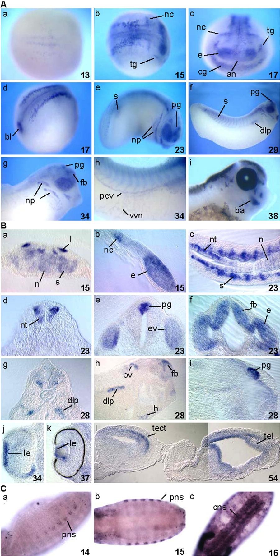Figure 1. XBTBD6 and lute expression during embryogenesis. A: In situ analysis of XBTBD6 expression. a,b: Dorsal views. c: Anterior view. d-i: Lateral views. B: Sections of XBTBD6 stained embryos. a: Transversal section. b: Parasagittal section. c: Horizontal section. d,e: Transversal sections at the level of the eye and spinal cord. f: Horizontal section of the head. g-i: Transversal (g) and parasagittal (h,i) sections. j,k: Transversal sections of the eye. l: Parasagittal section of a tadpolebrain. Nieuwkoop-Faber stages are indicated. C: In situ analysis of lute expression. a: Lateral view of a stage 14 embryo. b: Dorsal view of a stage 15 embryo. c: Ventral view of a stage 16 embryo. an, anteriorneuroectoderm; ba, branchial arches bcs; bl, blastopore; cg, cement gland area; cnr, cephalic neurogenic region; cns, central nervous system; dlp, dorsal lateral plate mesoderm; e, eye; fb, forebrain; g, gut; h, heart; le, lens; n, notochord; nc, neural crest; np, neurogenic placode; nt, neural tube; ov, otic vesicle; pcv, posterior cardinal vein; pg, pineal gland; pns, peripheral nervous system; s, somites; ; tg, trigeminal ganglia; tel, telencephalon; tect, tectum; vvn, vascular vitelline network. Staging according to Nieuwkoop and Faber ([1967]).
