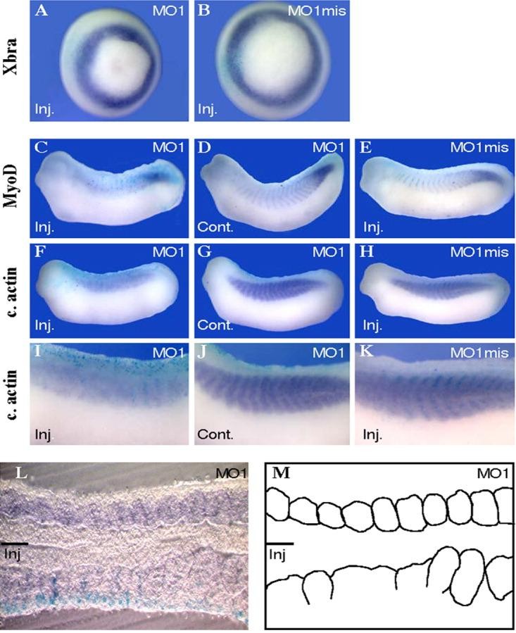 Figure 4. XBTBD6 knockdown affects muscle formation and segmentation. Embryos were injected on one side at the two-cell stage with either XBTBD6 MO1 or XBTBD6 MO1mis together with LacZ mRNA. Embryos were analyzed at gastrula or tadpole stage. A,B: Ventral views of embryos stained with Xbra. C,K: Lateral views of embryos stained with MyoD or c. actin. L: Horizontal section of a tail bud embryo stained with c. actin. M: Outline of muscle segmentation pattern observed in L.