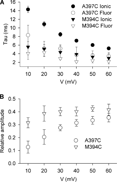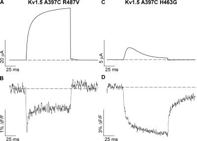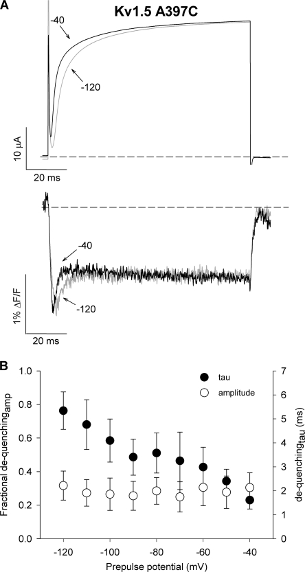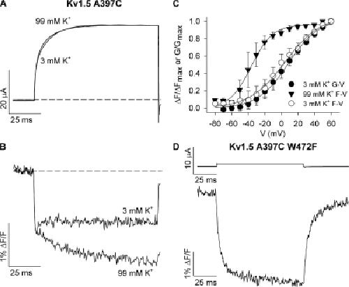 Voltage-gated potassium (Kv) channel gating involves complex structural rearrangements that regulate the ability of channels to conduct K(+) ions. Fluorescence-based approaches provide a powerful technique to directly report structural dynamics underlying these gating processes in Shaker Kv channels. Here, we apply voltage clamp fluorimetry, for the first time, to study voltage sensor motions in mammalian Kv1.5 channels. Despite the homology between Kv1.5 and the Shaker channel, attaching TMRM or PyMPO fluorescent probes to substituted cysteine residues in the S3-S4 linker of Kv1.5 (M394C-V401C) revealed unique and unusual fluorescence signals. Whereas the fluorescence during voltage sensor movement in Shaker channels was monoexponential and occurred with a similar time course to ionic current activation, the fluorescence report of Kv1.5 voltage sensor motions was transient with a prominent rapidly dequenching component that, with TMRM at A397C (equivalent to Shaker A359C), represented 36 +/- 3% of the total signal and occurred with a tau of 3.4 +/- 0.6 ms at +60 mV (n = 4). Using a number of approaches, including 4-AP drug block and the ILT triple mutation, which dissociate channel opening from voltage sensor movement, we demonstrate that the unique dequenching component of fluorescence is associated with channel opening. By regulating the outer pore structure using raised (99 mM) external K(+) to stabilize the conducting configuration of the selectivity filter, or the mutations W472F (equivalent to Shaker W434F) and H463G to stabilize the nonconducting (P-type inactivated) configuration of the selectivity filter, we show that the dequenching of fluorescence reflects rapid structural events at the selectivity filter gate rather than the intracellular pore gate.