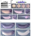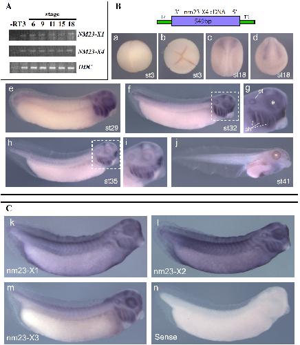 Figure 3. Expression of NM23-X4 and other Xenopus family members in embryogenesis. (A) Semi-quantitative RT-PCR analysis of NM23-X4 and NM23-X1 at stages 6, 9, 11, 15 and 18 of embryogenesis. Ornithine decarboxylase (ODC) was used as an internal control. (B) Whole-mount in situ hybridization of NM23-X4 with a probe containing the cDNA cloned in pBluescript. |