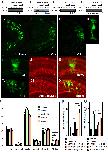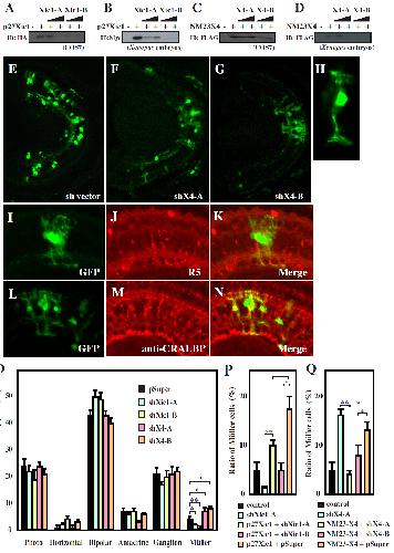 Figure 5. Reduction of NM23-X4 increases the Müller glial cell population. (A-D) shRNAs against p27Xic1 and NM23-X4 are efficient in knocking down their respective protein expression in cell culture and Xenopus embryos. The indicated short hairpin RNA (shRNA) constructs and the corresponding tagged expression constructs were co-transfected in COS7 cells and co-injected in two-cell stage Xenopus embryos. The effect was analyzed by immunoprecipitation of total lysate of cells or embryos (see Materials and methods). (E-G) Stage 41 retinal section after transfecting with pSuper vector and GFP (E), with shX4-A and GFP (F), or with shX4-B and GFP (G). (H) Enlarged view of a green fluorescent protein (GFP)-positive Müller glial cell transfected with shX4-B. (I-K) Staining against the Müller glial marker R5 at stage 41 retina transfected with shX4-B: (I) GFP; (J) R5 staining; (K) merged view. (L-N) Anti-CRALBP staining of Müller glial cells at stage 41 retina transfected with shX4-B: (L) GFP, (M) anti-CRALBP, (N) merged view. (O) Cell type distribution in the stage 41 retina transfected with the indicated construct plus GFP expressed in percentages. (P-Q) Rescue of the knock-down effect in the cell type distribution in the retina by co-introduction of shRNA construct with p27Xic1 (P) and NM23X4 (Q) expression constructs. The Müller glial cell percentages for each condition are shown. Single and double asterisks correspond to P ⤠0.05 and 0.01, respectively; error bars indicate standard error of the mean. |