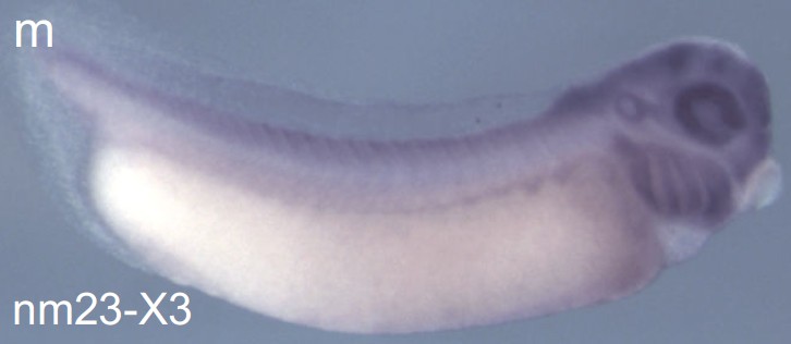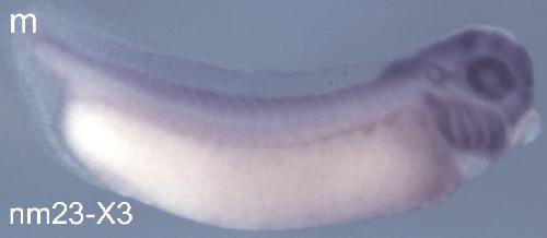 nme2 (NME/NM23 nucleoside diphosphate kinase 2) gene expression in Xenopus laevis embryo, assayed via in situ hybridization, NF stage 33, lateral view, anterior right, dorsal up. |