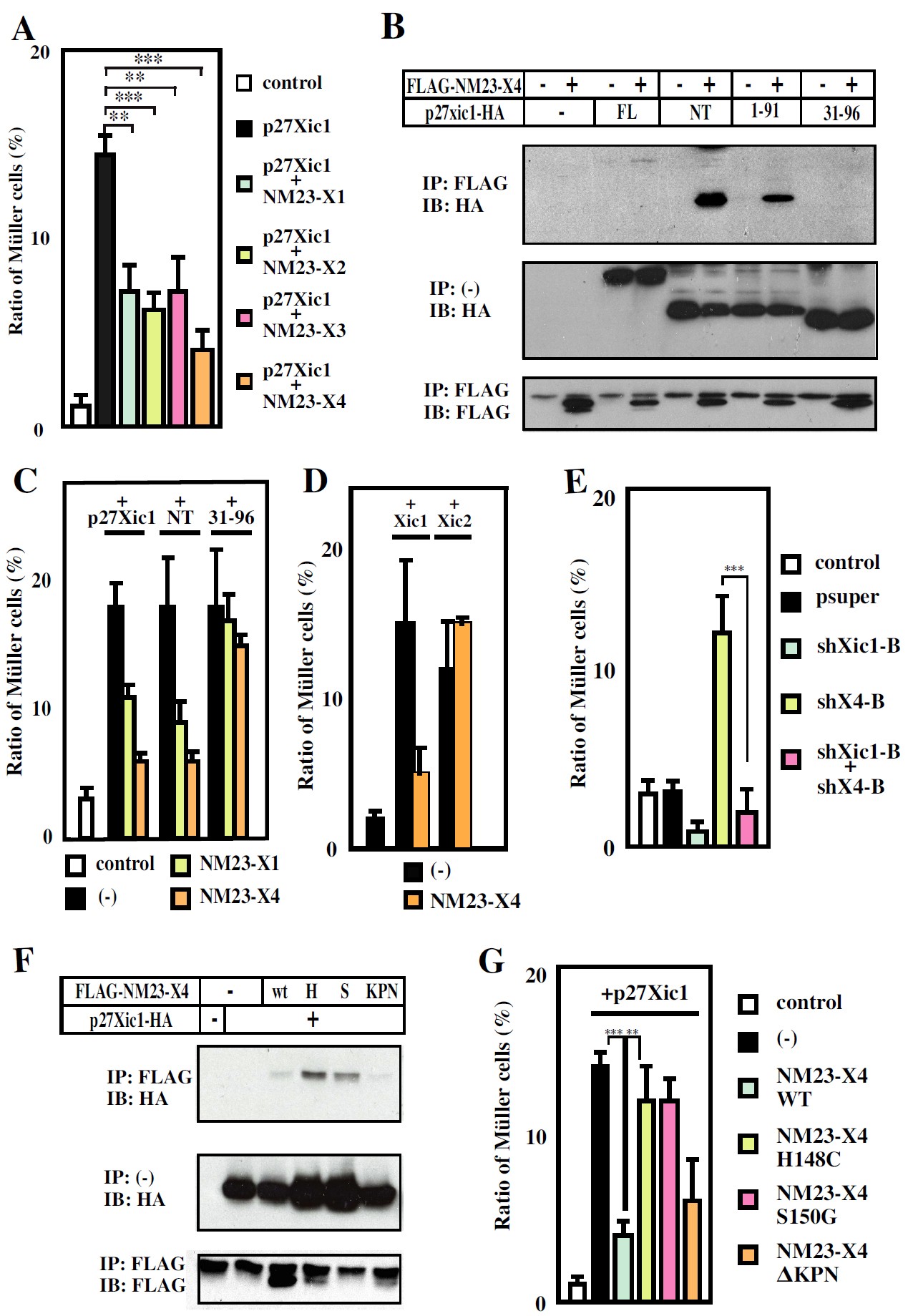 Figure 6. NM23 inhibits p27Xic1-mediated gliogenesis through their interaction. (A) Co-expression of a NM23 member with p27Xic1 inhibits p27Xic1-mediated gliogenesis. (B) Interaction of NM23-X4 with deleted versions of p27Xic1. Full length, amino-terminal NT(1â96), and 1â91 portions of p27Xic1 interact with NM23-X4, but the 31â96 portion does not. (C) The interaction between p27Xic1 and NM23 is responsible for the inhibitory function of NM23 on Müller glial cell phenotype. NM23-X4 blocked glial induction by interacting with the amino-terminal and 1â91 portions of p27Xic1 but not with the 31â96 portion. (D) NM23-X4 cannot inhibit gliogenesis mediated by p16Xic2. Müller glial cell percentage in the retina after co-introduction of NM23-X4 and Xic1 or Xic2. (E) Effect of co-introduction of shX4-B and -B constructs in the retina. Activation of gliogenesis by shX4-B requires p27Xic1. (F) Interaction of p27Xic1 with mutants of NM23-X4. Wild type (wt), H148C (H), S150G (S) and δKPN were tested for their interaction with p27Xic1. (G) Wild type and the δKPN blocked Müller cell induction by p27Xic1, but H148C and S150G did not. Double and triple asterisks correspond to P ⤠0.01, and 0.001, respectively; error bars indicate standard error of the mean. |