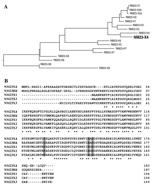 Figure 1. Sequence alignment of NM23-X4. (A) Phylogenetic tree of human and Xenopus NM23 members. The tree was constructed using the Clustal W method with the parameter PAM250. (B) Nucleotide sequence alignment of NM23-X4 with NM23-H4, -X1, -X2, and -X3. Asterisks indicate identical amino acids among all NM23 family members. The previously reported important amino acid residues are shown as shaded boxes. |