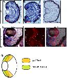 Figure 4. Expression pattern of NM23-X3, -X4 and p27Xic1 in Xenopus retina. (A, B) Both NM23-X3 (A) and NM23-X4 (B) are expressed in the CMZ of Xenopus retina as shown by in situ hybridization on stage 41 cryosections. Red brackets indicate the expressed regions in the CMZ. (C) Sense-probe used as negative control. (D, E) NM23-X4 expression pattern in the retinal CMZ (D) overlaps with that of p27 (E), as underlined by dotted lines in blue and red, respectively. In situ hybridization was done at stage 39 sequential cryosections with signal visualized with BM purple and Fast Red, respectively. (E) Merged image; white dotted line marks the retinal epithelium boundaries. (G) A schematic diagram of expression of p27Xic1 and NM23-X4 or -X3 in embryonic Xenopus retina. |