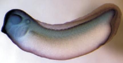 hck (HCK proto-oncogene, Src family tyrosine kinase) gene expression in Xenopus laevis embryos, NF stage 28, as assayed by in situ hybridization, lateral view, anteriorleft, dorsal up.