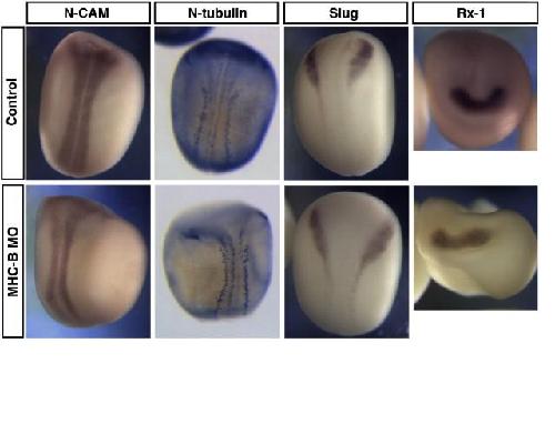 Fig. S1. Targeting MHC-B MO to neural tissue does not alter neural cell fates. Stage 17 un-injected control embryos and neural targeted MHC-B morphants stained by in situ hybridization show similar patterns of expression of N-CAM, a pan neural marker, N-tubulin, a marker for prospective primary neuron, Slug, a neural crest marker and Rx1, an eye-field marker, indicating that neural patterning is not affected by MHC-B MO.