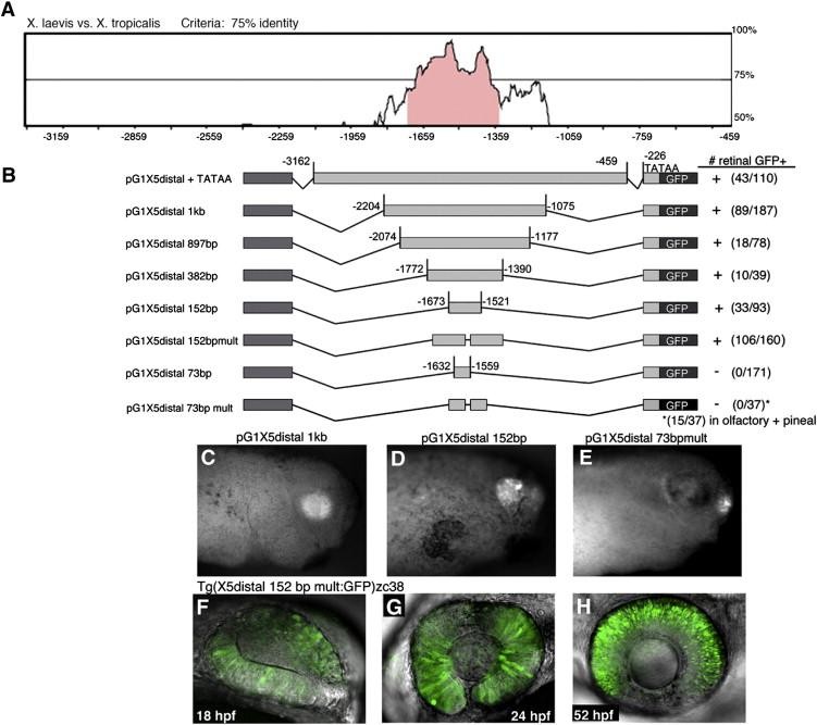 Fig. 1. Identification of a conserved minimal Xath5 distal enhancer that promotes retinal expression in vivo. (A) Pairwise mVISTA (http://genome.lbl.gov/vista/index.shtml) analysis of X. laevis and X. tropicalis Xath5 5â² distal noncoding sequences identifies a 1 kb highly conserved region. (B) A series of nested deletion constructs were generated to identify a minimal 152 bp enhancer that is sufficient to promote retinal specific expression. + strong expression, â/+ very weak expression, â no expression (C) A stage 33 pG1X5 distal 1 kb transgenic embryo shows retinal GFP expression. (D) The 152 bp distal enhancer also drives GFP in the retina. (E) A pG1X5 distal 73 bp transgenic embryo does not express GFP in the retina but only expresses in the pineal gland and olfactory placodes. (FâH) The zc38 transgenic zebrafish line exhibits specific expression in the retina as shown in confocal z-projections at 18 hpf (F), 24 hpf (G), 52 hpf (H) Anterior is to the right in all panels. |