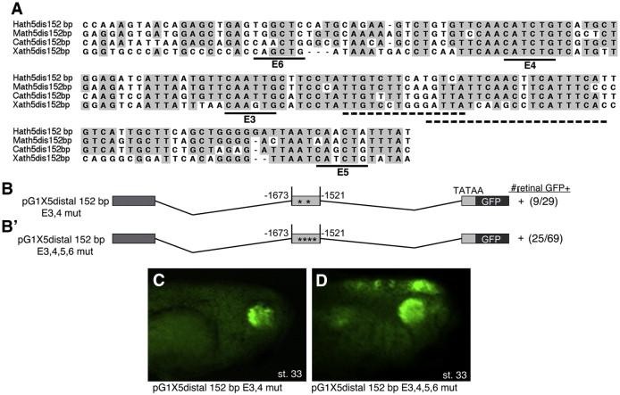 Fig. 3. The 152 bp Xath5 distal enhancer does not depend upon conserved E-boxes. (A) ClustalW alignment of the 152 bp distal enhancer sequence between human, mouse, chick and X. laevis shows blocks of highly conserved sequence (gray). Black lines mark the 4 conserved E-boxes in this region (CANNTG). + strong expression. Mutation of E-boxes E3 and E4 (B) or all 4 E-boxes E3âE6 (Bâ²) does not reduce retinal GFP expression in transgenic embryos. (C) A stage 33 pG1X5 distal 152 bp E3,4 mut embryo shows GFP expression in the retina. (D) A stage 33 pG1X5 distal 152 bp E3,4,5,6 mut embryo show GFP expression in the retina as well as ectopic expression in the neural tube and cranial ganglia. Dashed lines mark the 2 overlapping Pax6 sites in the distal enhancer. |