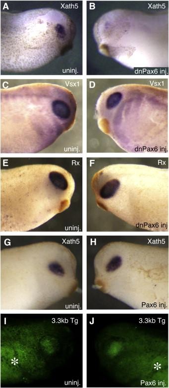 Fig. 4. Pax6 is required for Xath5 expression but is not sufficient to induce Xath5 expression. Overexpression of dnPax6 mRNA decreases Xath5 expression on the injected side (AâB) but does not affect expression of the progenitor markers Vsx1 (CâD) or Rx (EâF). Overexpression of Pax6 mRNA is not sufficient to induce ectopic Xath5 expression (GâH) or ectopic pG1X5 3.3 kb transgene expression (IâJ). Gut autofluorescence. |