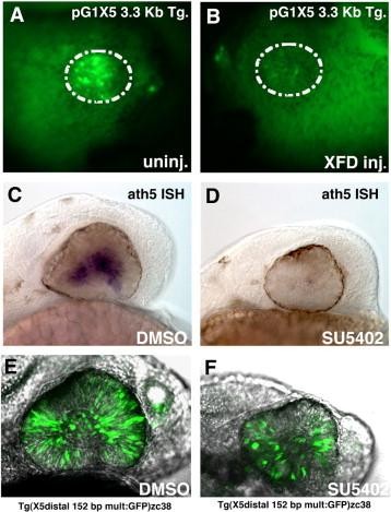 Fig. 7. FGF signaling acts to regulate Xath5 expression through the 3.3 kb enhancer sequence but this effect is not mediated via the 152 bp distal enhancer. Overexpression of XFD mRNA in pG1 X5 3.3 kb transgenic embryos inhibits transgene expression on the injected side (AâB). Ath5 expression is blocked in zebrafish embryos treated with SU5402 vs. DMSO treated embryos (CâD). zc38 transgenic embryos treated with SU5402 express GFP throughout the retina, similar to DMSO treated controls (EâF). |