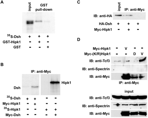Figure 1. Hipk1 interacts with Dsh and Tcf3.(A) 35S-Met-labelled Dsh precipitates in a complex with the partial-length Hipk1 GST-tagged clone from the yeast-2-hybrid screen, but not with GST alone. (B) Immunoprecipitation (IP) of 35S-Met-labelled Dsh with Myc-tagged Hipk1 (left panel), and reciprocal 35S-Met-labelled Hipk1 IP with Myc-tagged Dsh (right panel), using in vitro translated proteins. (C) IP of Dsh with Hipk1 when both proteins are recombinantly expressed in X. laevis embryos. (D) Endogenous Tcf3 IP with recombinantly expressed Myc-(K/R) Hipk1 in ventral X. laevis embryos. An anti-Spectrin antibody was used as a negative control for the IP (top) and as a loading control for the input (bottom). |