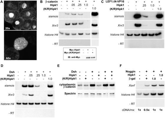 Figure 4. Hipk1 is nuclear and acts at the level of transcription during X. laevis development.(A) Confocal micrographs of animal pole explants recombinantly expressing Myc-tagged Hipk1 and visualized with anti-Myc antibody. Hipk1 localizes strongly to the nucleus and nuclear speckles, with low-levels of apparent extra-nuclear signal near the plasma membrane. (BâD) Hipk1 over-expression blocks activation of the Wnt-responsive genes siamois and Xnr3 downstream of β-catenin (B), Lef/Tcf (C), and Dsh (D). X. laevis embryos were uninjected (lanes furthest on left in all panels) or injected with synthetic RNAs encoding β-catenin (B), LEF1δN-VP16 (C) or Dsh (D). Nanogram quantities of RNAs encoding Myc-Hipk1, Myc-(K/R)Hipk1 or β-galactosidase were co-injected as indicated. RT-PCR was used to assess target gene activation; histone H4 was assessed as a loading control, and reactions without reverse transcriptase (âRT) performed to rule out genomic DNA contamination. (B, inset) Myc-tagged Hipk1 and (K/R)Hipk1, injected at 1 ng per blastomere, are expressed at comparable levels in X. laevis as demonstrated by western blot. (E) Over-expression of Dsh in HEK293T cells leads to an increase in cytoplasmic β-catenin that is not affected either positively or negatively by over-expression of Hipk1. (F) Induction of Xanf by Noggin in X. laevis animal caps is not affected by over-expression of Hipk1. |