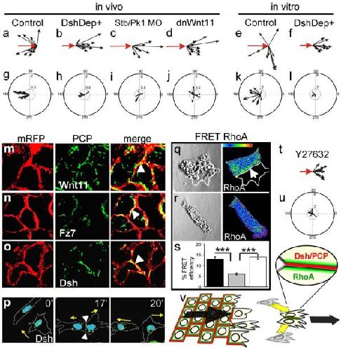 Figure 4. Contact Inhibition of Locomotion: requirement of PCP and RhoA activitiesCell collisions were analysed in vivo (a-d, g-j) and in vitro (e, f, k, l). Velocities (a-f) and accelerations (g-l) were measured after the indicated treatments. Scale is the same for all panels. The change of velocity is significantly and clustered in the controls (p<0.005, n=10). No significant change is observed in any of the PCP treatments (p>>0.05, n=10 for all cases) (m-p). Different PCP components are localised at the cell-cell contact (arrowheads). mRFP: membrane-RFP; (m) Wnt11-YFP. (n) Fz7-YFP. (o) Dsh-GFP. (p) Cells expressing Dsh-GFP were analysed during a cell collision. The outline of the cell is taken from the DIC images, time in minutes; arrow: direction of migration; arrowhead: cell contact showing Dsh localization. (q-u) Role of RhoA. (q-s) FRET analysis of RhoA activity. (q) Two NC cells in contact showing RhoA activity localised at the cell contact (arrow). (r) Single NC cell. (s) RhoA FRET efficiency. Black bar: cells in contact; grey bar: single cell; white bar: single cell in which PCP has been activated by expression of DshΔN. ***: p<0.005; n= 12 each condition. (t, u) Cell collisions were analysed in the presence of the Rock inhibitor Y27632. (t) Velocity vectors; (u) acceleration vectors. No significant change in the velocity (p>>0.05, n=10) (v) Contact Inhibition of Locomotion is controlled by localization of PCP elements (red) and RhoA activity (green) at the cell contact leading to directional migration (arrows).
