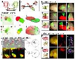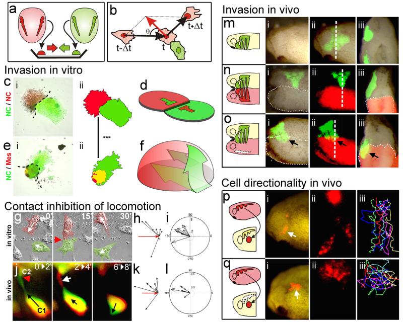 Figure 2. Contact Inhibition of Locomotion in NC cells in vitro and in vivo(a) Experimental design. (b) Analysis of Contact Inhibition of Locomotion. Mean velocities were measured Δt minutes before and after the collision. Acceleration (red) was calculated for each cell. Angle of collision calculated after initial trajectory alignment (θ). (c-f) Invasion of confronted explants. (c) There is no invasion in NC/NC confrontations (i), outlines in (ii), overlapping area in yellow; schematised in (d). (e) NC explants completely invade and cover mesodermal explants (i), outlines in (ii), overlapping area in yellow; schematised in (f). Green arrows in f: NC path of invasion (see Supplementary Fig. 3 for supporting confocal images). (g-l) Contact Inhibition of Locomotion. (g) Collision between two pseudocoloured NC cells in vitro. Time in minutes. White arrows: direction of migration; red arrowhead: collision. (h) Velocity vectors for NC in vitro, initial velocity vector (red arrow). (i) Acceleration vectors for NC collisions in vitro. They are clustered after the collision (p<0.005, n=10). (j) Collision of two NC cells (C1, C2) in vivo shown as the difference between two consecutive two-minute frames. Green: new area; red: collapsing area; black arrow: direction of migration; red arrowhead: cell contact; white arrow: collapsing protrusion. (k) In vivo velocity vectors. (l) In vivo acceleration. They are clustered after the collision (p<0.01, n=10). (m-o) NC invasion in vivo. i, ii: lateral view; iii: transverse section along the dashed line showed in ii. NC cells are not able to invade an adjacent embryo that has NC (n; 0% of invasion, n=15), but they can to invade an embryo without NC (o; arrow, 80% of invasion, n=10). (p, q) Cell directionality in vivo. A small group of Nuclear-RFP-labelled NC cells were grafted into a normal embryo (p) or in an embryo in which the NC were previously removed (q). Note that grafted cells migrate directionally in the intact embryo (persistence: 0.6±0.04, n= 30), but not when the host NC were removed (persistence: 0.2±0.02, n=20).