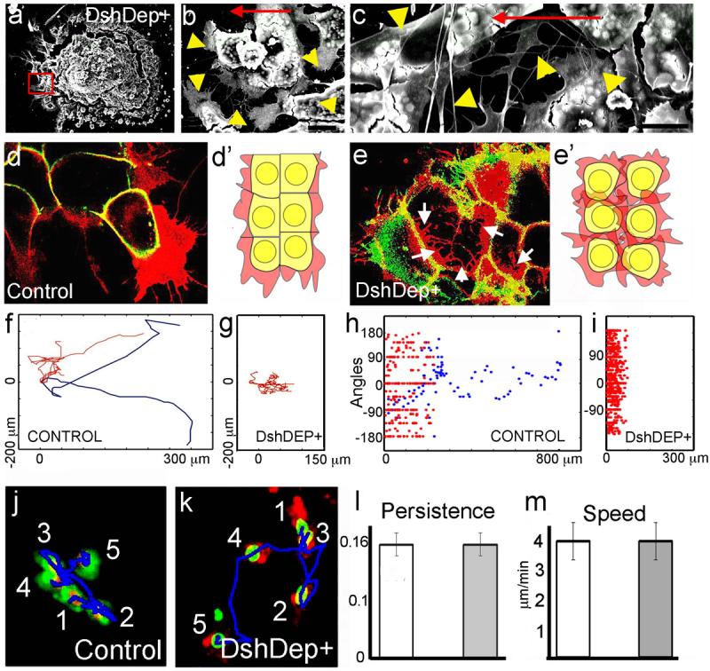 Figure 3. Effect of PCP signalling on cell contacts(a-c). SEM of Xenopus cultured NC expressing DshDep+. Red square indicates leading cells. Higher magnification views of other leading cells are shown in b and c. Arrowheads: cell protrusions; arrow: direction of migration. Bars: 25μm in b, 50μm in c. (d, e) Two-Plane Confocal image to show cell protrusions (red) and cell shape (green). Cell protrusions are produced only at the border of the control explant (d), while they are observed between the DshDep+ cells (arrows in e). (d', e') Schematic representation of d and e. (f-i) Analysis of tracks of migrating NC cells. Blue: leading cells; red: trailing cells. Tracks of control (f) or DshDep+ (g) cells. Distribution of angles of migration for leading (blue) and trailing (red) control (h) or DshDep+ (i) cells versus the distance from the origin. (j-m) Analysis of migration of dissociated NC cells. (j, k) Five frames taken every 10 min were overlapped for a control cell (j) and a DshDep+ cell (k). Numbers: consecutive position of the cell. Blue line: track. Persistence (l) and Speed (m) were calculated for control (white bar) and DshDep+ (grey bar) cells. (p<0.05; n= 62).