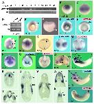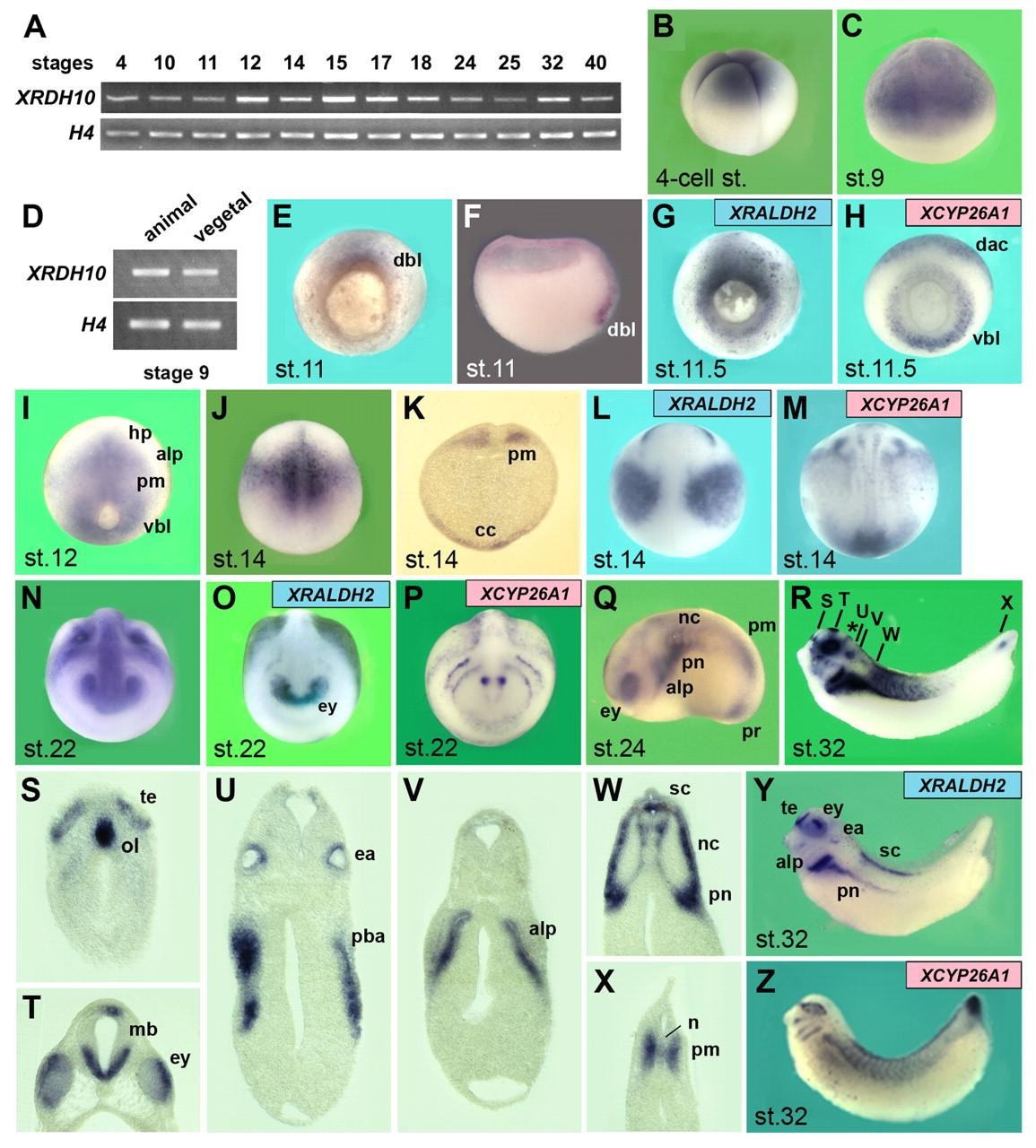 Fig. 2. Expression of Xenopus RDH10. (A,D) RT-PCR analysis of whole embryos (A) and embryonic explants (D). Histone H4 was used as an RNA loading control. (B,C,E-Z) Whole-mount in situ hybridization with an antisense RNA probe for XRDH10 (B,C,E,F,I-K,N,Q-X), XRALDH2 (G,L,O,Y) and XCYP26A1 (H,M,P,Z). Embryos are shown in lateral (B,C,Q,R,Y,Z), vegetal (E,G,H), dorsal (I,J,L,M) and anterior (N-P) views. Specimens are hemi-sectioned (F) and transversally sectioned (K,S-X). The asterisk in R indicates the midbrain-hindbrain boundary. alp, anterior lateral plate; cc, cardiac crescent; dac, dorsal animal cap; dbl, dorsal blastopore lip; ea, ear; ey, eye; hp, head process; mb, midbrain; n, notochord; nc, neural crest; ol, olfactory system; pba, posterior branchial arch; pm, presomitic mesoderm; pn, pronephros; pr, proctodeum; sc, spinal cord; te, telencephalon; vbl, ventral blastopore lip. |