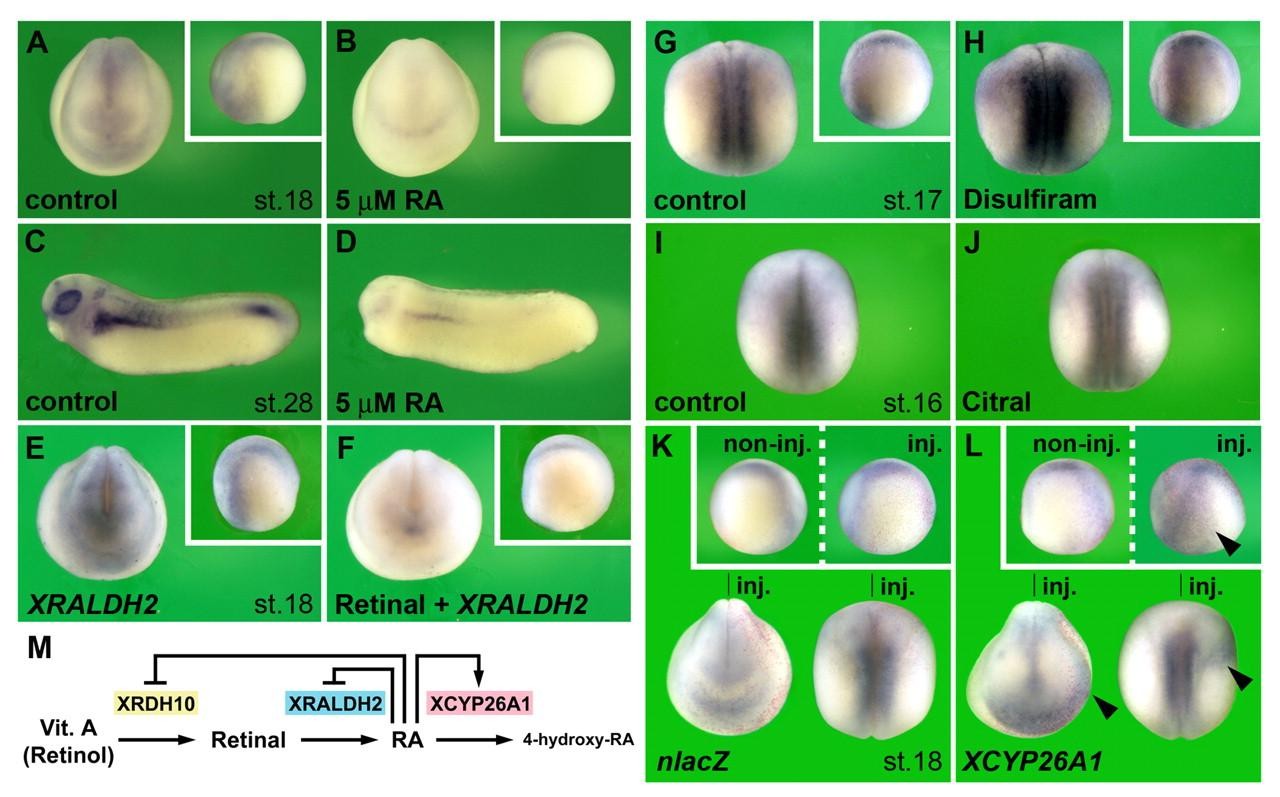 Fig. 3. Retinoic acid downregulates XRDH10 expression. (A-L) Whole-mount in situ hybridization analysis of XRDH10 transcription at neurula (A,B,E-L) and tailbud (C,D) stage. Embryos are shown in anterior (A,B,E,F,K,L), lateral (C,D, insets) and dorsal (G-L) views. (A-D) Embryos were treated from stage 11 (A,B) or stage 16 (C,D) onwards with 0.05% DMSO as a control or with 5 µM retinoic acid (RA). Note that RA induces a significant reduction in XRDH10 expression. (E,F) Embryos were microinjected into the animal pole at the four-cell stage with 2 ng XRALDH2 mRNA and treated from stage 11 onwards with 0.05% ethanol as a control (E) or 5 µM retinal (F). (G-J) Treatment from stage 11 onwards with the RA inhibitors disulfiram (10 µM) or citral (20 µM) causes an elevation of XRDH10 expression. (K,L) Embryos were animally injected into a single blastomere at the four-cell stage with 300 pg nlacZ mRNA as lineage tracer (red nuclei) alone (K) or together with 2 ng XCYP26A1 mRNA (L). Note that XCYP26A1 induces an upregulation of XRDH10 expression on the injected side (arrowhead). The indicated gene expression patterns were obtained in: A, 55/55; B, 22/31; C, 30/30; D, 37/37; E, 11/11; F, 16/17; G, 29/29; H, 49/49; I, 31/31; J, 54/57; K, 36/36; L, 48/53 embryos. (M) Negative-feedback regulation of RA biosynthesis. |